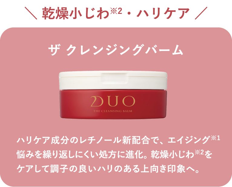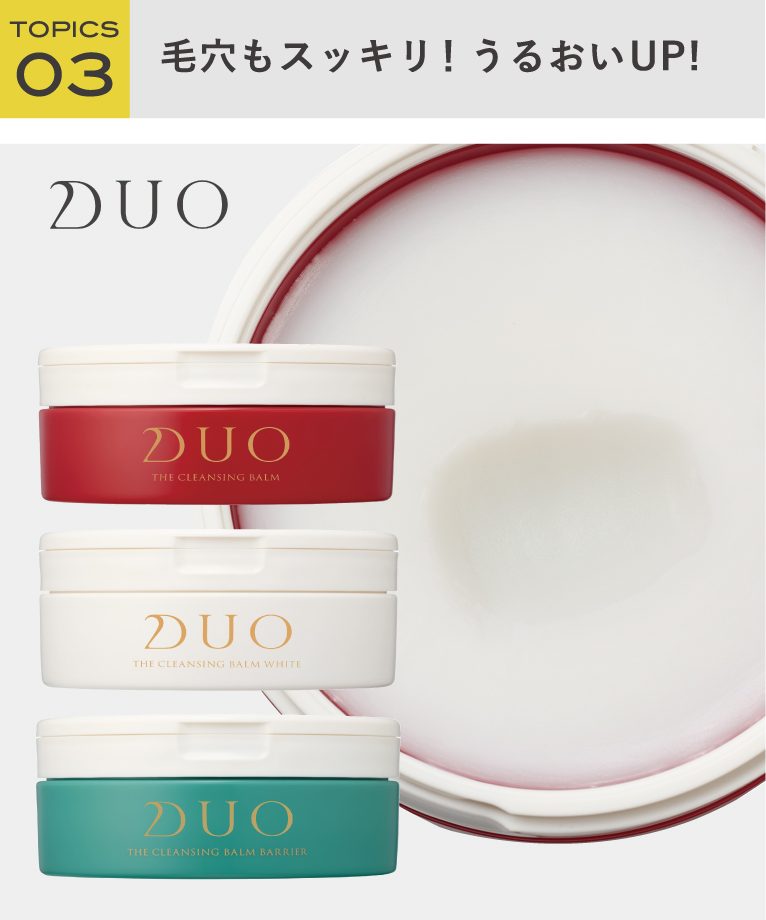ブランド誕生から15年、今では多くの方に愛される大ヒットアイテムとなった「DUOクレンジングバーム」がさらなる進化をとげてリニューアル!肌負担を減らしながらの高い洗浄力やとろける摩擦レスなテクスチャーというDUO独自の特徴はそのままに「美容効果」 「洗い上がりのしっとり感や持続力」「香り」がパワーアップしました!