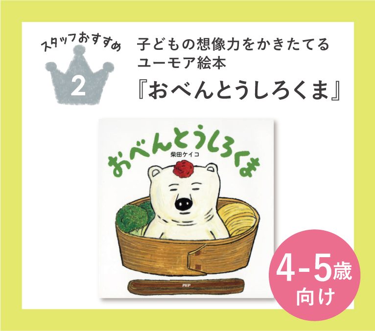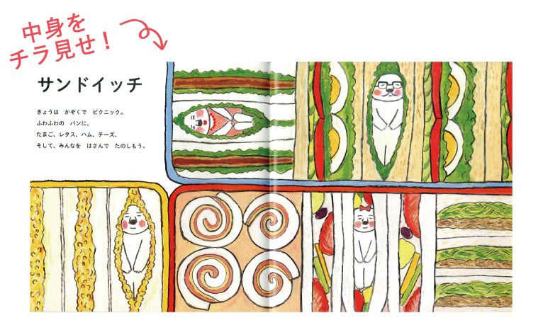お弁当が大好きなくいしんぼうのしろくまは「おべんとうの中に入ってみたらどんな感じかな?」と、想像をふくらませます。しろくまのなんとも言えない表情に心もほっこり。出てくるお弁当もとっても美味しそうで、しろくまがのりべんに顔を突っ込んでいるところは大人も笑ってしまいます。「どのお弁当がすき?」など、子どもとのやりとりも楽しめる1冊です。
