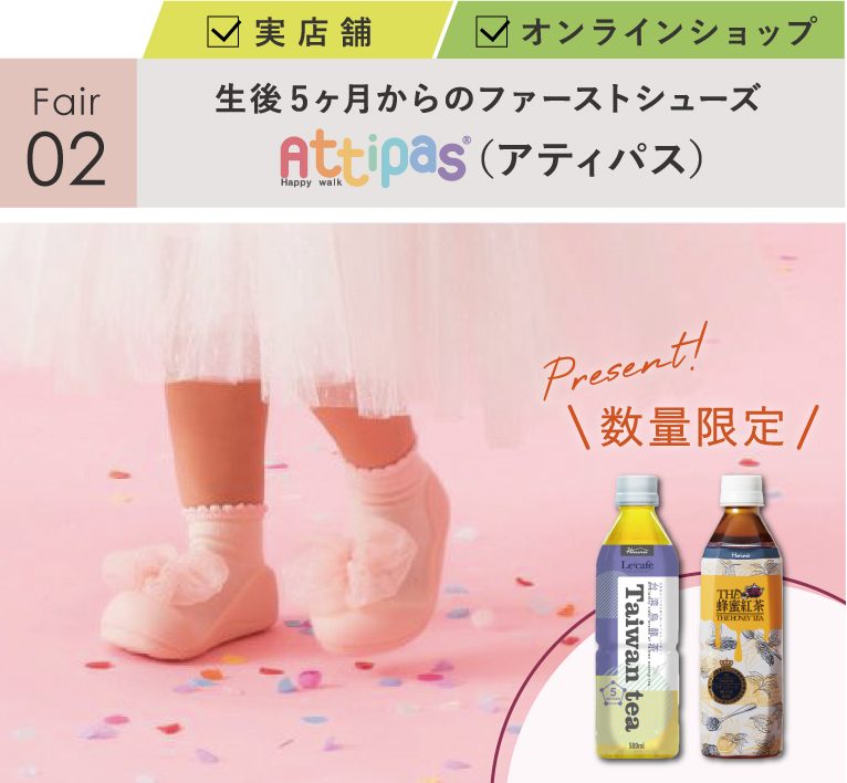 赤ちゃんが生まれながらに持っている足裏の感覚を最大限に生かせるよう赤ちゃんの足を研究してつくられた、歩育シューズ「アティパス」。ソックスとシューズをドッキングした独自のフォルムが特徴です。
