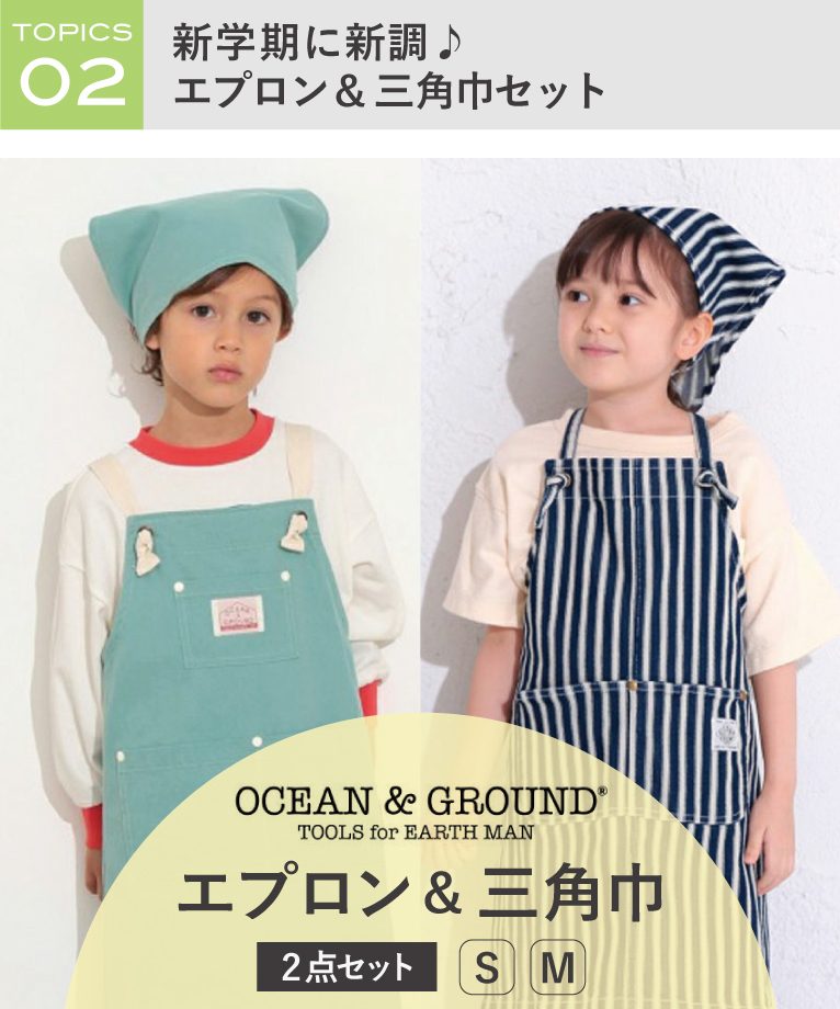 給食の配膳や調理実習、ママのお手伝い、お菓子づくりなどいろんなシーンで大活躍のエプロン♪『OCEAN&GROUND(オーシャン&グラウンド)』のエプロンは、かぶるだけで簡単に着られるバッククロスタイプ。おそろいの三角巾もゴム入りでかぶるだけ!使いやすさにこだわったエプロンセットです。