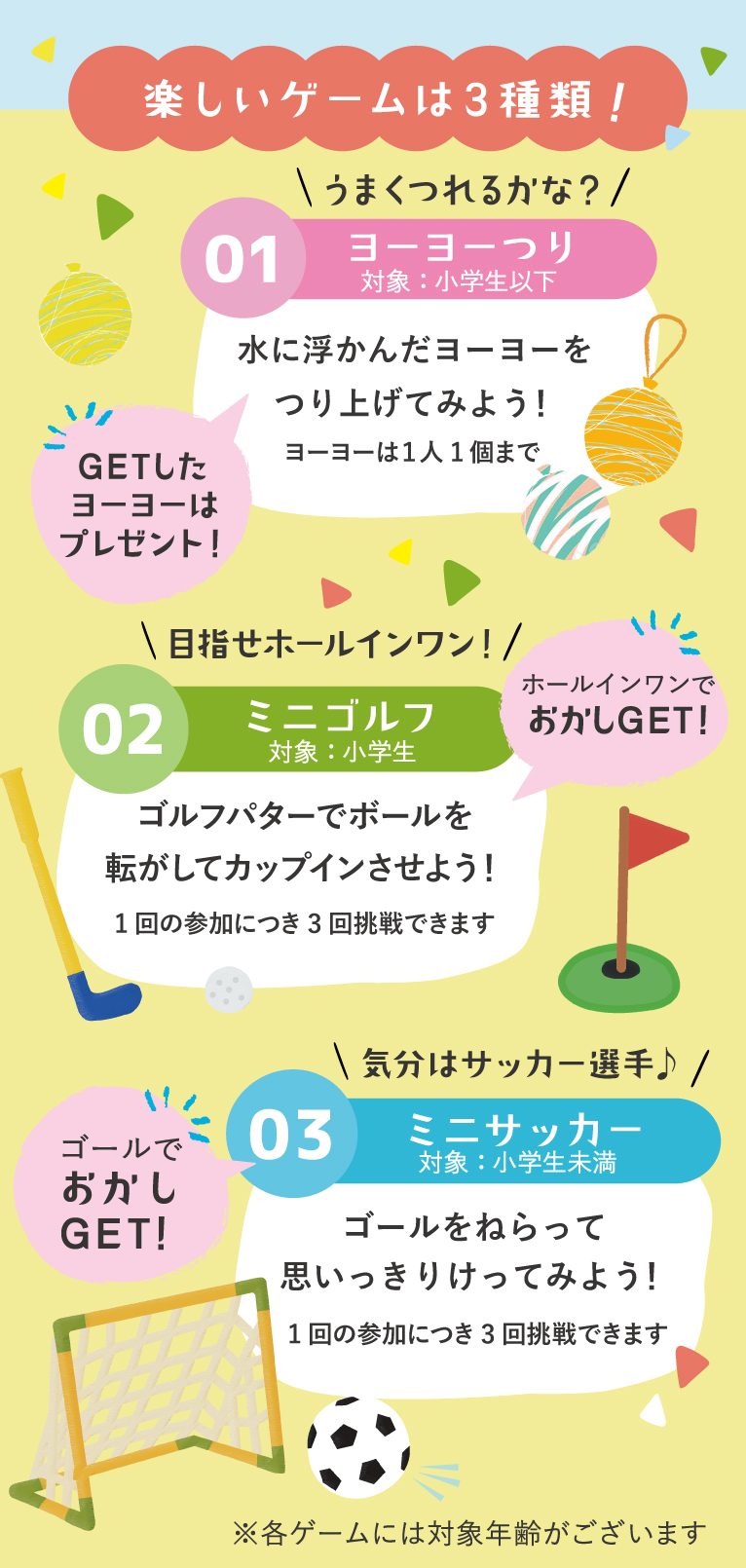 ヨーヨーつりやミニゴルフなどのゲームに挑戦して景品をゲットしよう♪