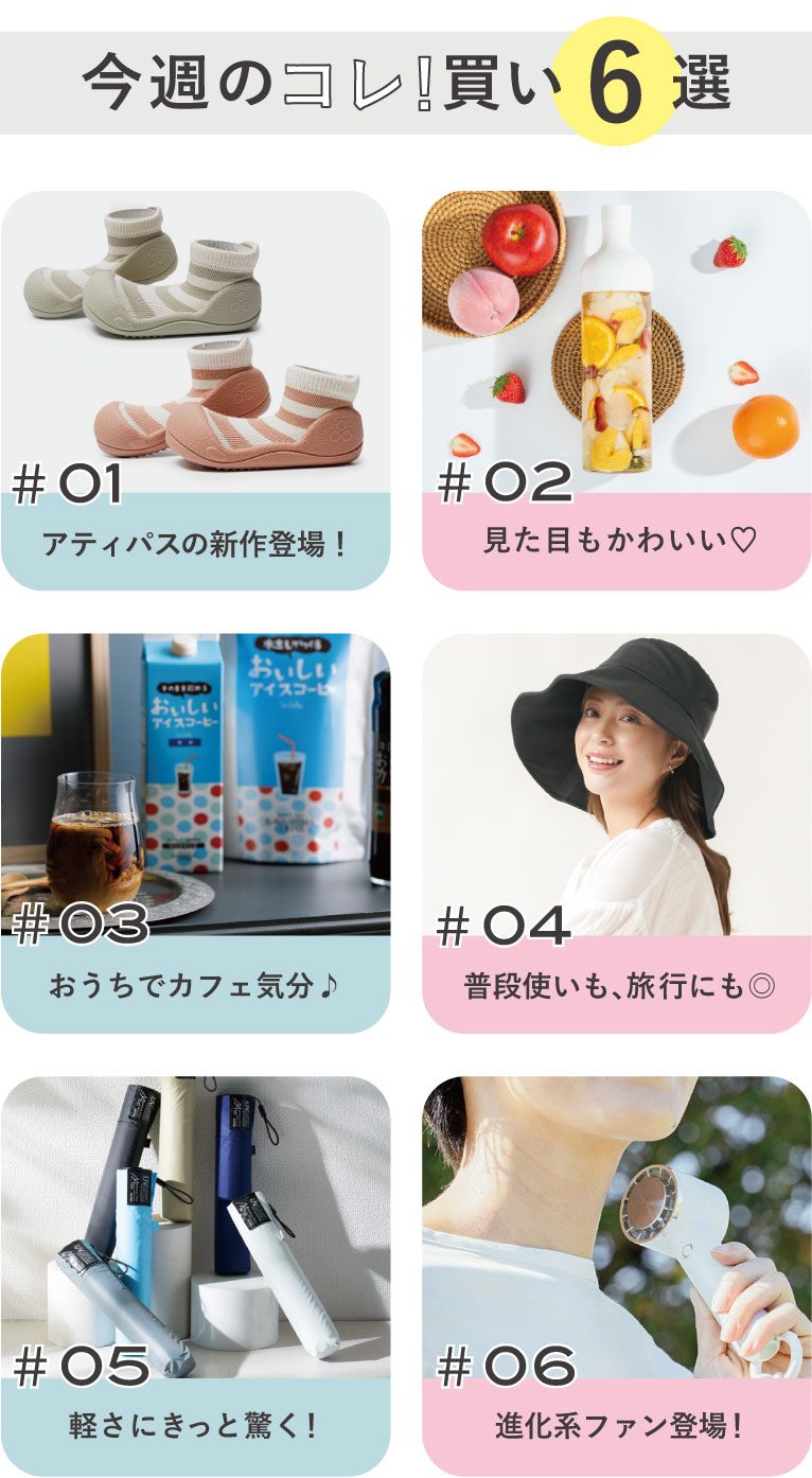 ひんやり冷たいアイスコーヒーやおしゃれなフルーツティー、外遊びにも大活躍のキッズシューズに、話題の冷却プレート付き扇風機など、涼しく楽しく過ごすためのアイテムが続々入荷中です!