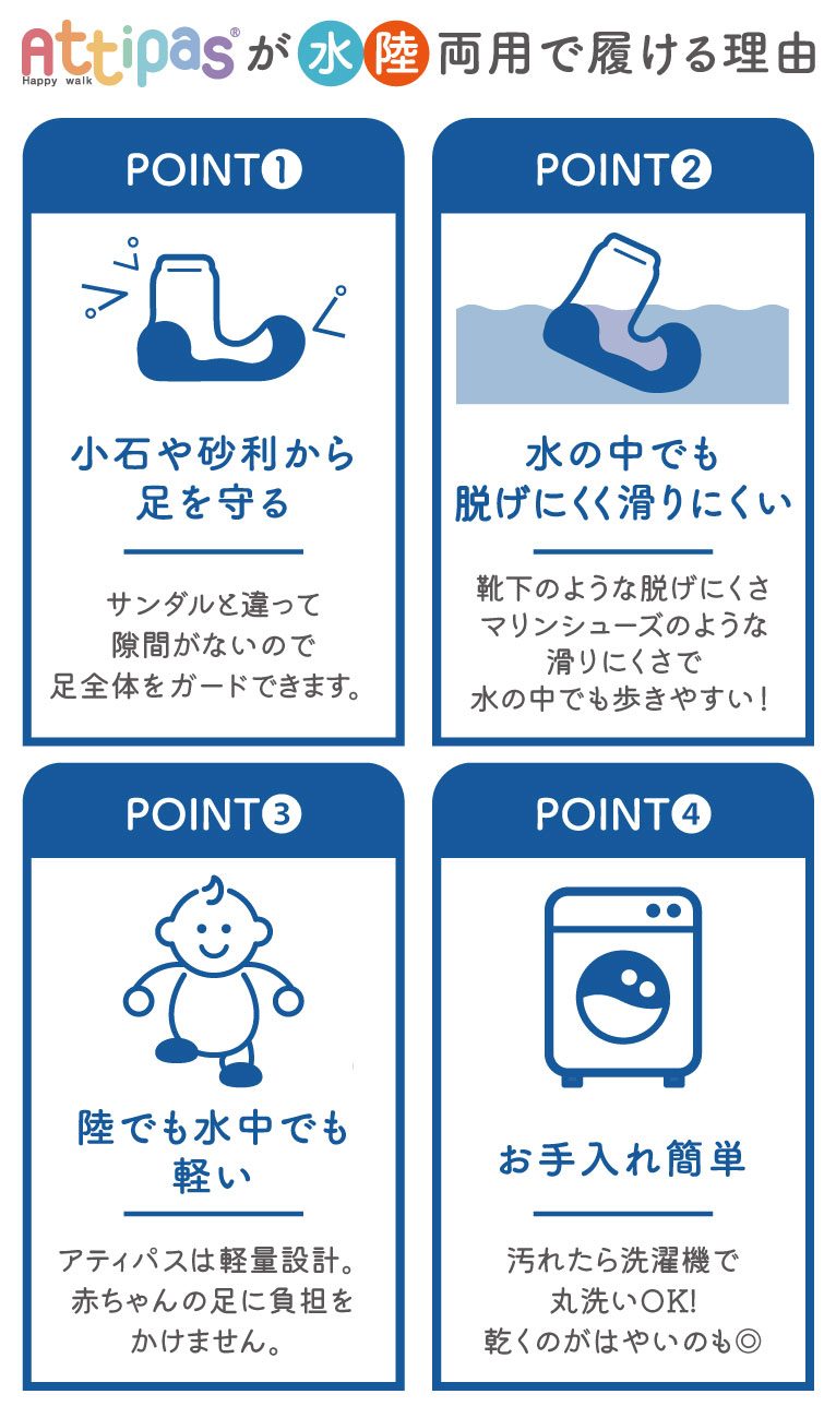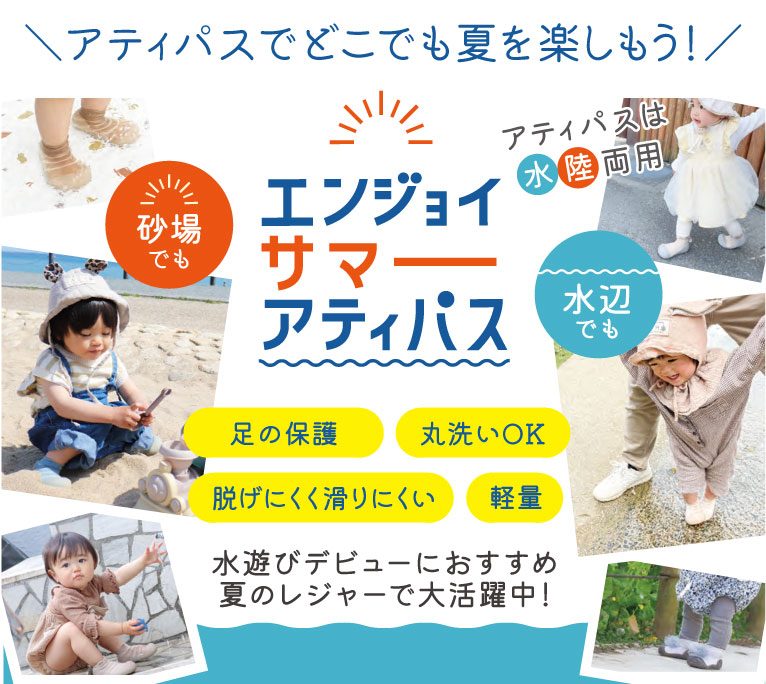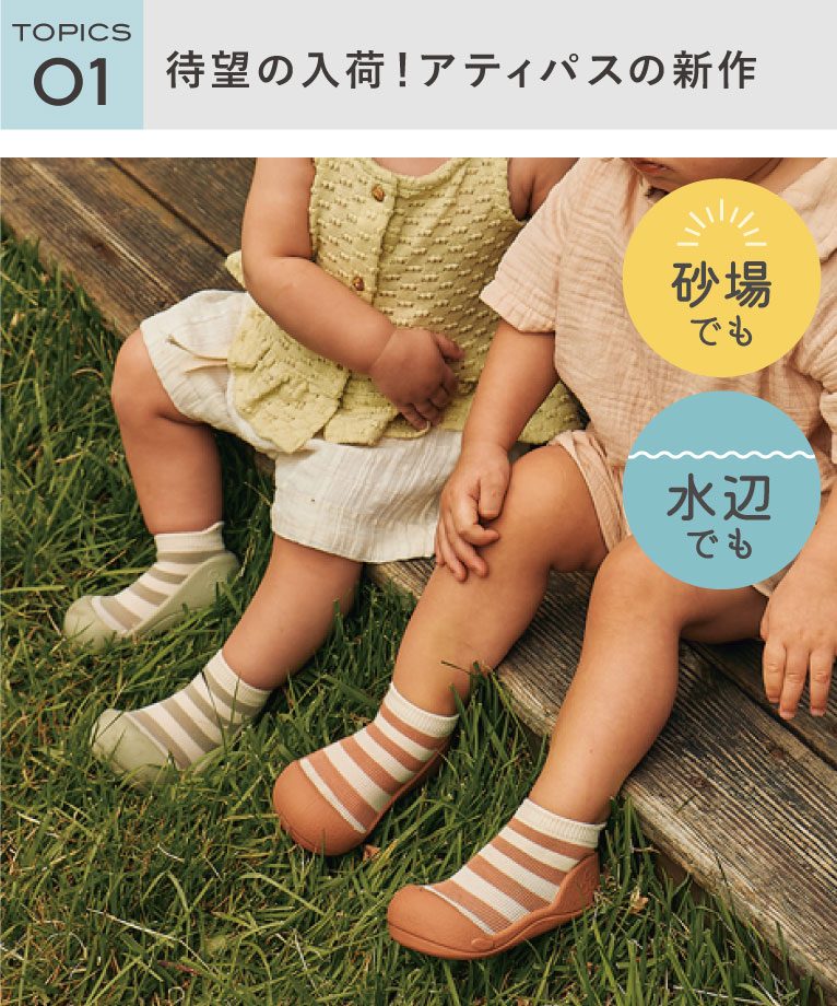 赤ちゃんが生まれながらに持っている足裏の感覚を最大限に生かせるよう赤ちゃんの足を研究してつくられた、歩育シューズ「アティパス」。ソックスとシューズをドッキングさせた独自のフォルムが特徴です。