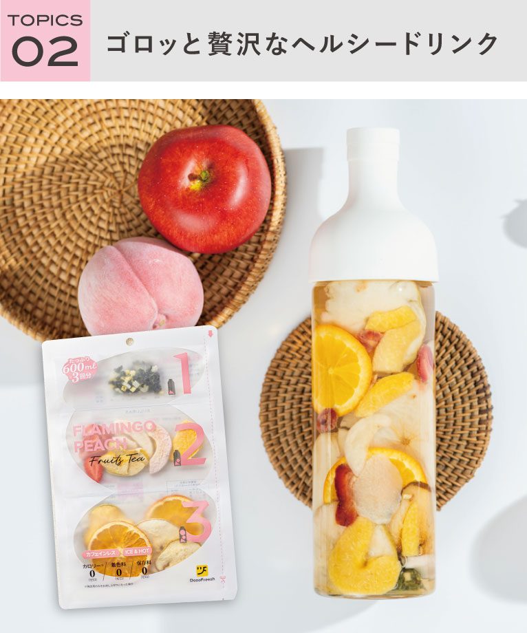 砂糖、着色料、保存料不使用の見た目もかわいい「DozoFreesh フルーツティー」。各フルーツと相性の良い茶葉が使用されており、フルーツの良さを引き出します。パッケージの1・2・3の順でティーパックとドライフルーツを入れて水やお湯を注ぐだけで簡単♪600ml×3回分楽しめてコスパも◎カラフルでキュートなパッケージなのでプレゼントにもおすすめです。