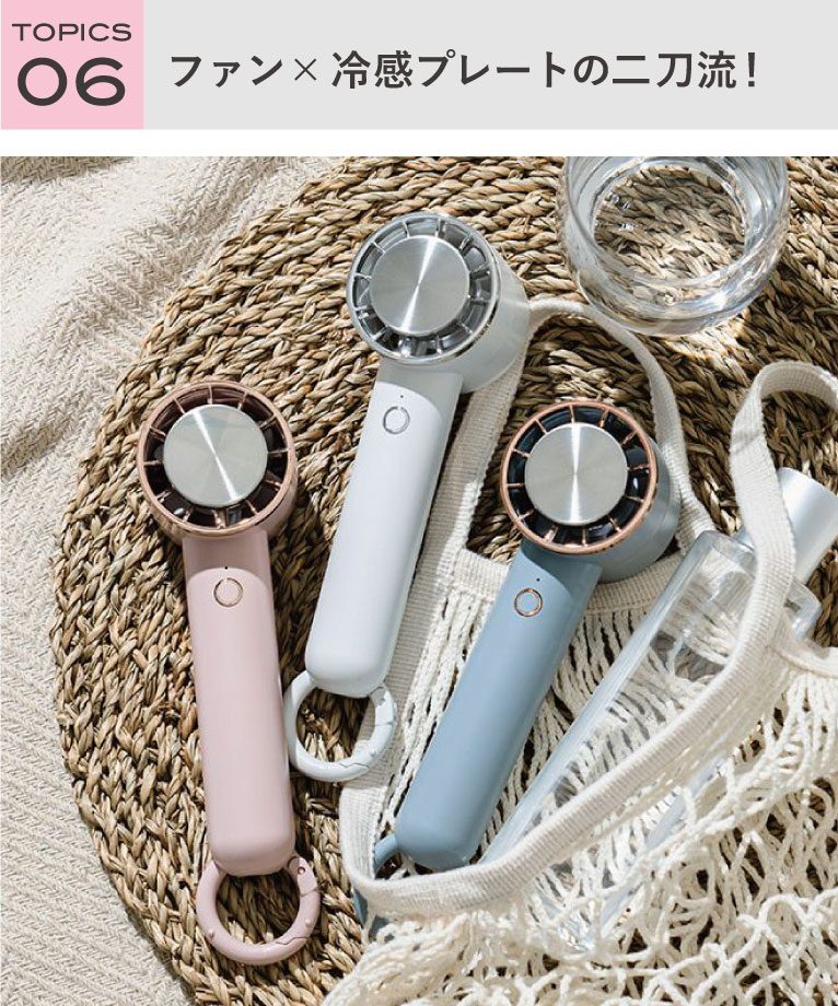 扇風機に冷却プレートを搭載した「ペルチェ冷却機能ハンディファン」。汗をかいたらファンの風で涼感を得られて、汗が噴き出るような真夏日には、冷感プレートで首、手首などに当てれば即リフレッシュ!