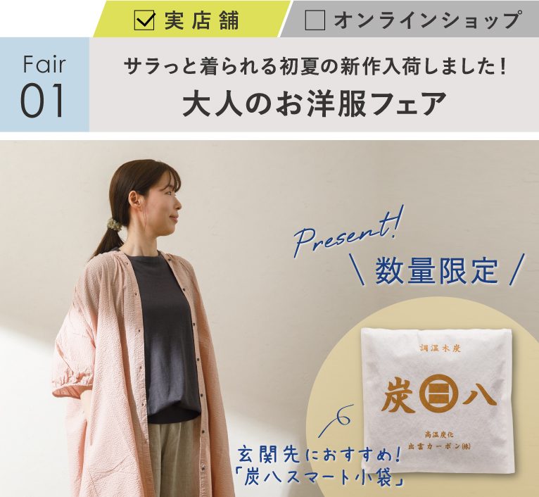 大人のお洋服を¥15,000(税込)ご購入ごとに「炭八スマート小袋」を1点プレゼント!