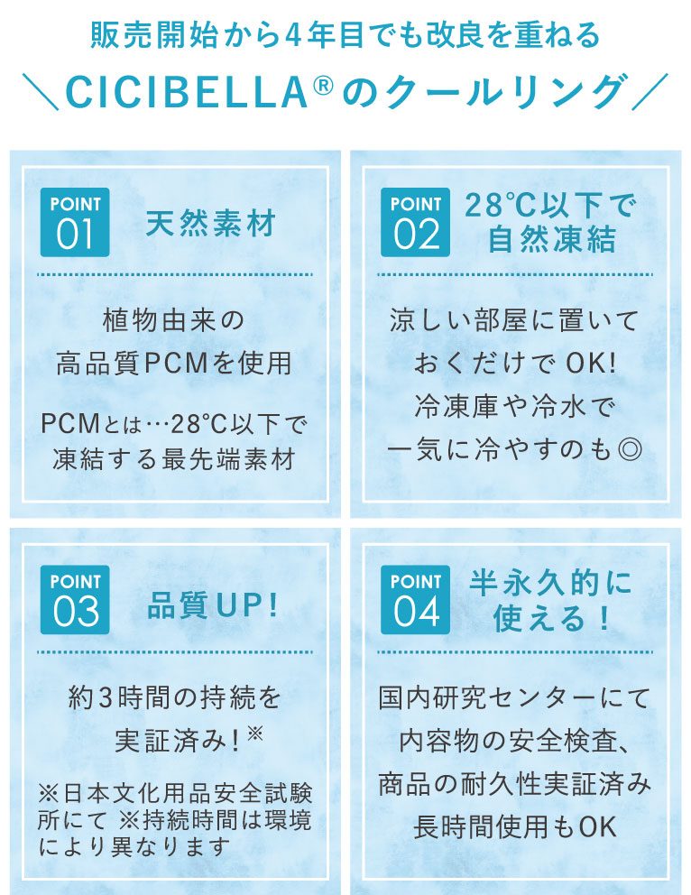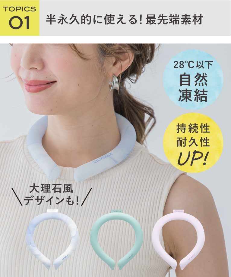 夏の定番アイテムになった「クールリング」が機能性アップして今年も登場!28℃以下で自然凍結するので、溶けてきたら28℃以下の部屋に置いたり、流水をかけるだけで冷たさが復活します。もちろん、冷凍・冷蔵使用も可能です。
