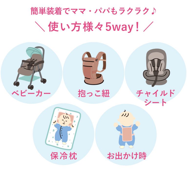 紐の通し方によって、リュックタイプ・アイス枕・抱っこ紐・ベビーカー・チャイルドシートに取り付けるなど5通りの使い方ができる暑い夏の必須アイテム。付属の保冷ジェルは、カチカチに固まらず柔らかいシャーベット状になるタイプ。冷たい時間が保ちやすくなっています。