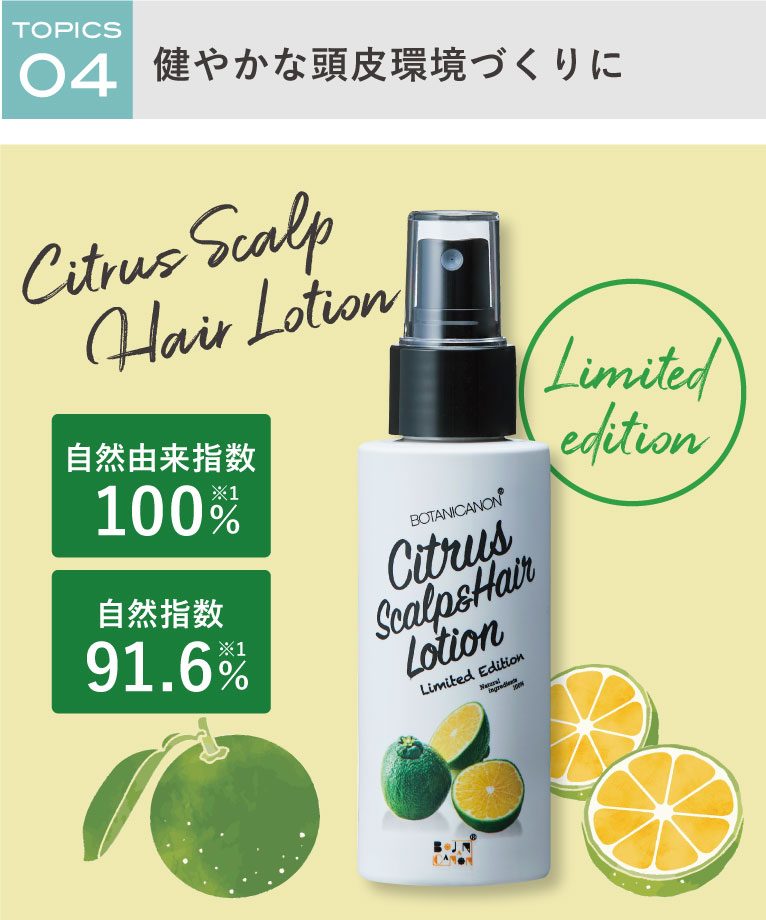 水を一切使用せずに、シトラス蒸留水(※2)と14種類の植物エキス(※3)とを贅沢に使用したスカルプローション。頭皮環境が気になる方には、まず1本使ってみていただきたいアイテムです。お風呂上がりに、天然アロマに包まれる心地良さは最高です!