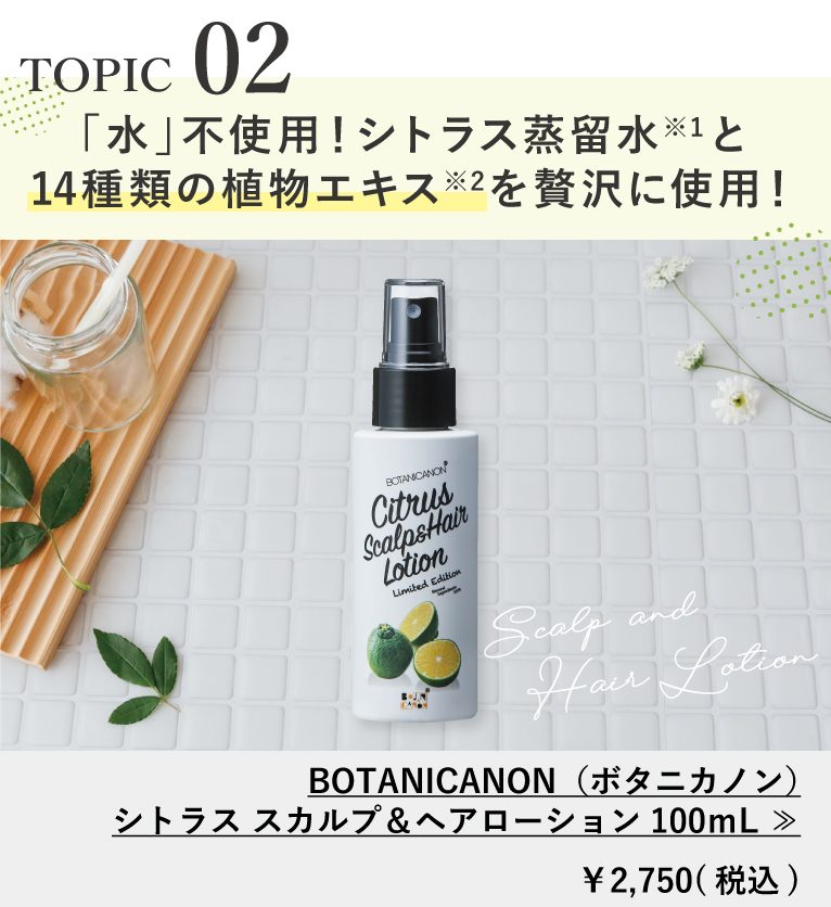 「シトラス スカルプ&ヘアローション」は水を一切使用していません!自然由来成分100%のシトラス蒸留水が、枝毛や切毛を防ぎ、自然なツヤを与えます。