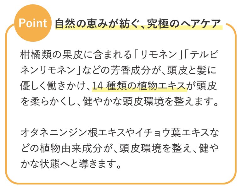 お風呂上がりに、爽やかな香りの天然アロマに包まれる心地良さは最高です!頭皮環境が気になる方には、まず使ってほしい1本です。