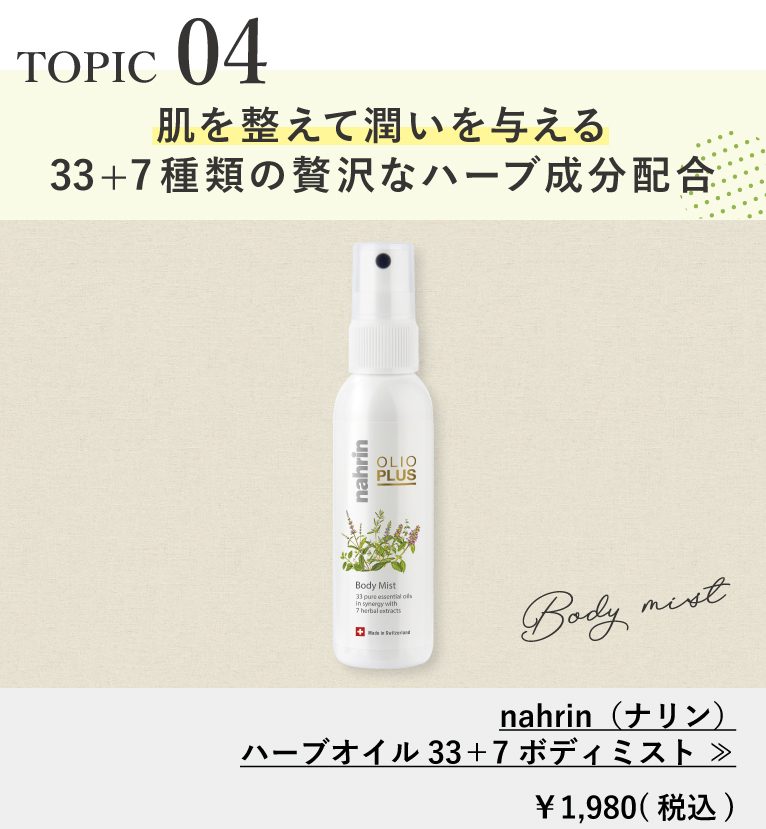 『nahrin(ナリン)』の塗るアロマオイルをヘビーユースしていますが、夏は断然こちらのボディミストがおすすめ!