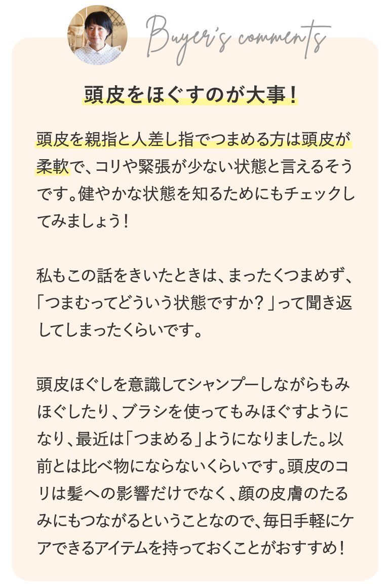 ベタつかないのに、髪が柔らかく潤いをキープ。一度使うと手放せない!と長く愛用するリピーター様が多いアイテムの1つ。乾いた髪はよりダメージを受けやすくなるので、予防のためにも髪のパサつきを放置しないことが、夏枯れ髪予防の鍵!髪の乾燥が激しい方は、はじめは特にたっぷりお使いください。