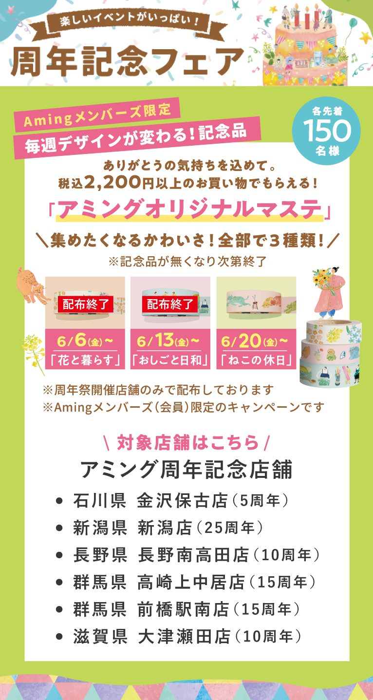このたび、アミング6店舗がそれぞれの周年を迎えることとなりました!5周年~25周年と年数はそれぞれ異なりますが、ここまで続けてこられたのは、地域の皆さまと日々アミングをご愛顧くださるお客様のおかげです。心より感謝申し上げます。