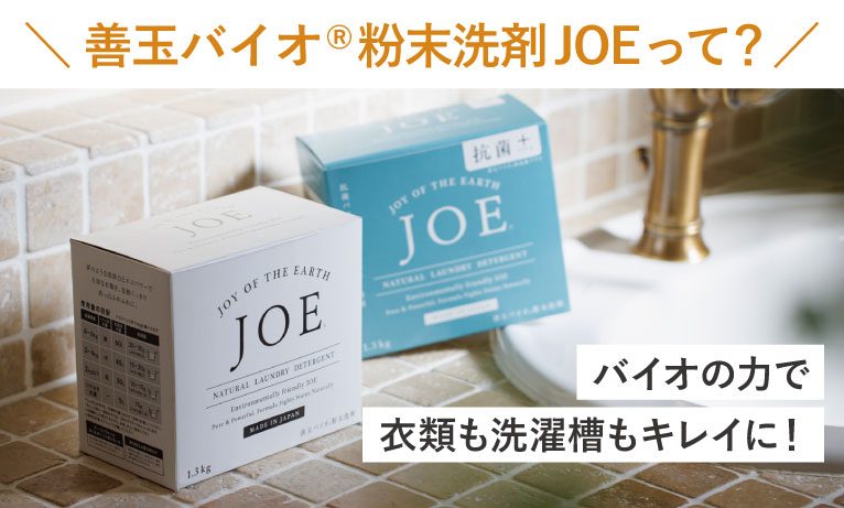 洗濯のプロも認める優れた洗浄力とバイオの力で様々な洗濯の悩みにアプローチする洗濯用洗剤「善玉バイオ(R)粉末洗剤 JOE」。キレイになった洗濯物に再び汚れを寄せ付けない“再汚染(※)防止力”や界面活性剤をほとんど使わない肌に優しい成分などが魅力です。