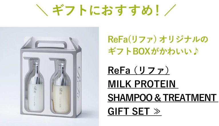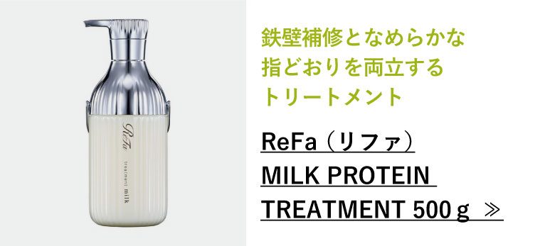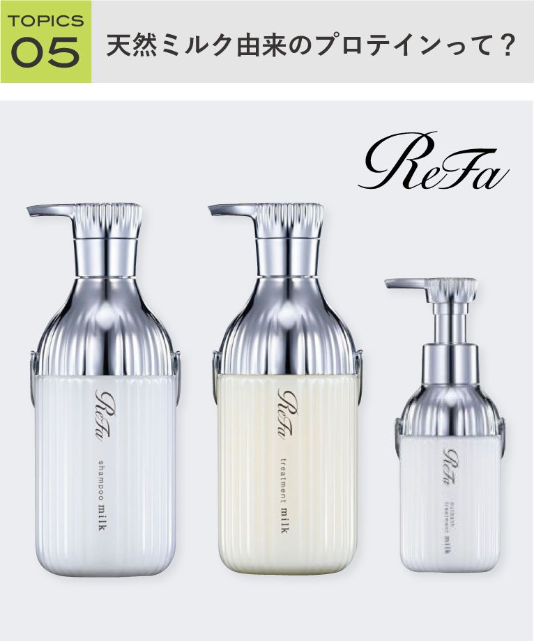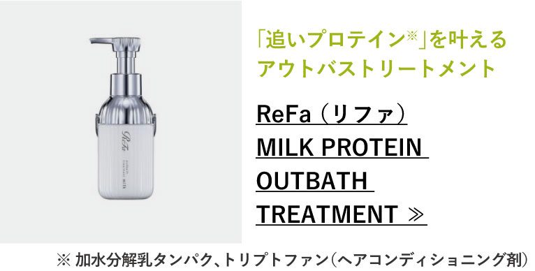 私たちの髪は、なんと80%がタンパク質。髪にもタンパク質が必要だということが重要視されはじめています。リファは、毛髪によくなじむ天然ミルク由来のプロテイン(※)に着目し、毎日のシャンプーで潤いを補充して“とぅるん”とまとまるなめらかな指どおりの髪へ導きます。さらに、トリートメントで内部だけでなく毛髪表面もしっかりと立体補修。毛先まで重厚感のある、なめらかな手触りに仕上げます。