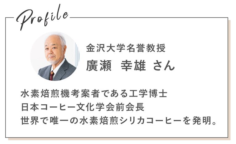 工学博士の廣瀬幸雄先生は、金沢大学名誉教授として、84歳になられた現在も、教鞭をとっていらっしゃいます。先日、カフェにお邪魔した際も、今もいろんな研究を行っていることを教えてくださり「水素焙煎アモルファスシリカ入り水出し珈琲」の魅力や特徴、水素焙煎がなぜ美味しいコーヒーを生み出すのか?についてとても分かりやすく楽しそうにお話してくださいました。