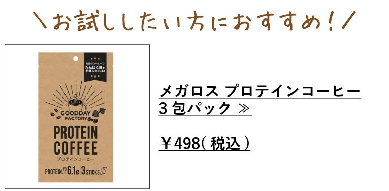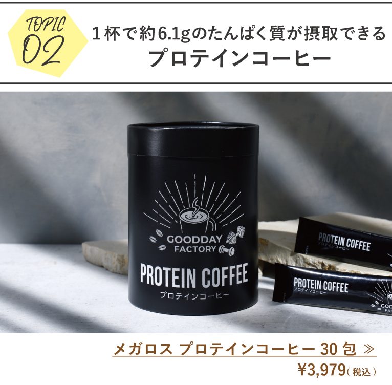 「メガロス プロテインコーヒー」は、1杯でたんぱく質 6.1g(約たまご一個分)が摂取できて、さらに、お水でも(もちろんお湯でも)溶けやすいから、朝の目覚めや午後のリフレッシュに、アイスでもホットでも、日常の“美容と健康の習慣”として自然に取り入れられる一杯です!