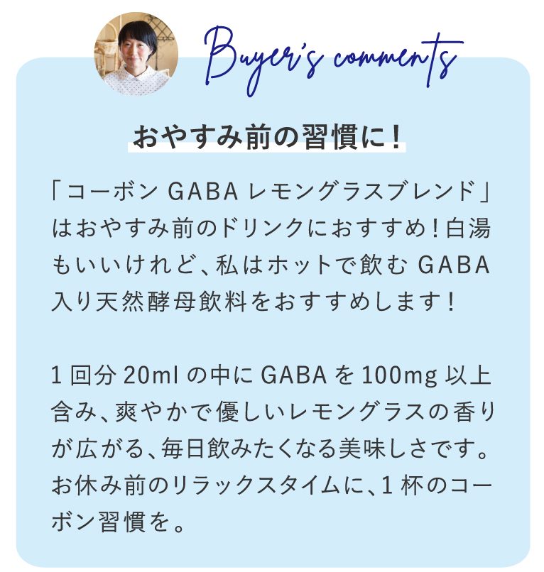 植物由来にこだわり、大麦由来のGABAを使用。1杯分20mlにGABA100mgと菌活をサポートするコーボンオリジナル酵母10億を含んでいます。さらに爽やかなオーガニックレモングラスが入っているので、おやすみ前のリラックスタイムにおすすめのドリンクです。