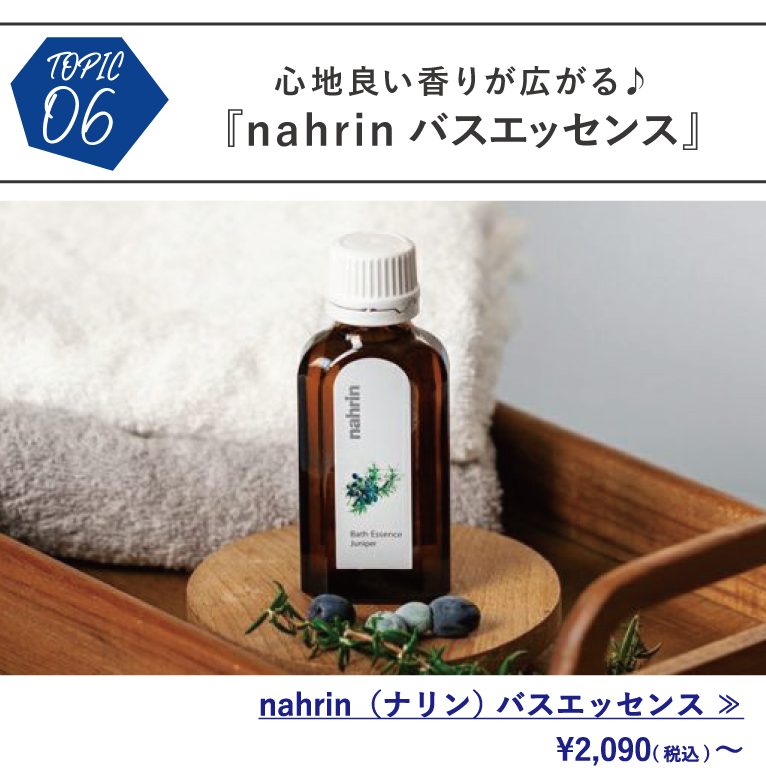 『nahrin(ナリン) 』のバスエッセンス(バスオイル)はナリンが得意とするブレンド力を存分に堪能いただけるアイテムのひとつです。