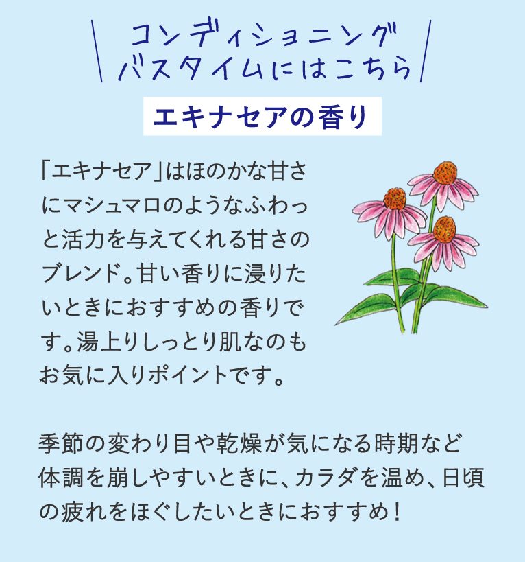 保湿効果の高い植物成分によって乾燥した肌をしっとりとさせ、テーマに合わせたエッセンシャルオイルやハーブエキスの香りが心地良いバスエッセンスです。