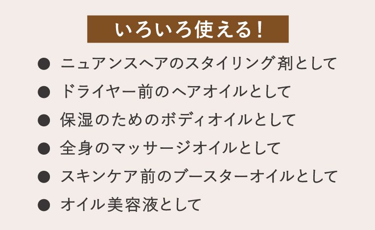 ヘアに限らず、肌やハンド&ネイルにもご使用いただけます。