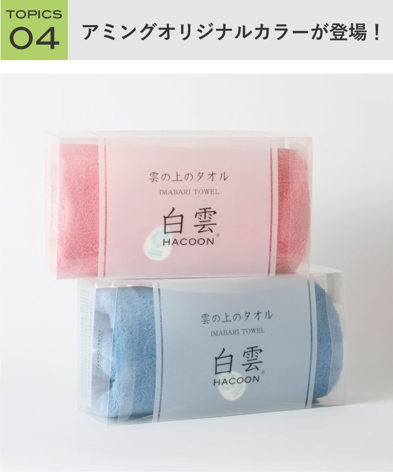 雲のようにふっくら、柔らかくなめらかな肌ざわりのタオルにアミングオリジナルカラーが登場!素材にこだわり、綿本来の柔らかさを引き出したふわふわの使い心地は、まるで雲の上にいるような心地良さです。
