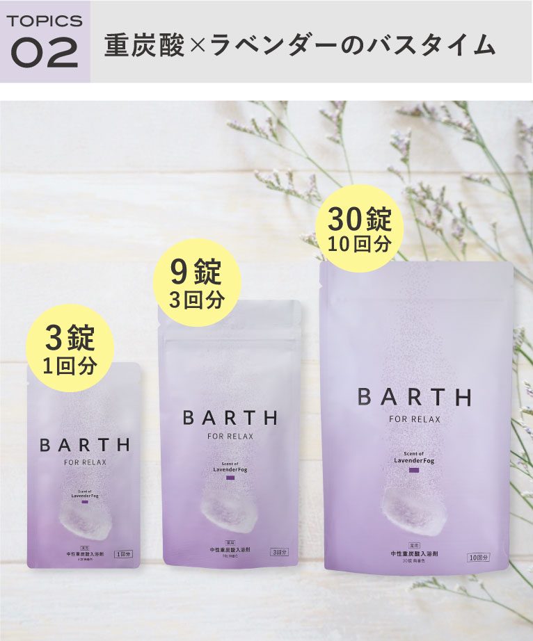 「BARTH FOR RELAX」は、眠りに向き合う『BARTH』の中性重炭酸入浴剤。重炭酸イオン(※1)が温浴効果を高め、疲労回復をサポート。お湯に溶けて微細な泡を発生させ、濃度を長時間キープします。ラベンダーを含む10種の天然精油(※2)をブレンドした優しい香りが、おやすみ前のリラックスタイムにおすすめ。
