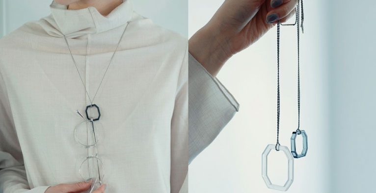 眼鏡の掛け外しが多い方・サングラスを掛ける方のためにつくられたアイウェアループ。ネックレスのトップ部分にテンプルを引っ掛けて使用するネックレスタイプです。