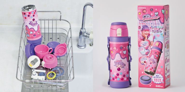 「sokomo そこまで洗える3WAYキッズボトル」は、その名のとおり“そこまで”しっかり洗える衛生設計。パーツがすべて外せてお手入れ簡単です。ストロー飲み・直飲み・コップ飲みの3WAYで、成長に合わせて長く使えるのもうれしいポイント。おでかけや通園にぴったりな600mLサイズで、“しなこちゃん”の世界観あふれるデザインが毎日を楽しくしてくれます♪