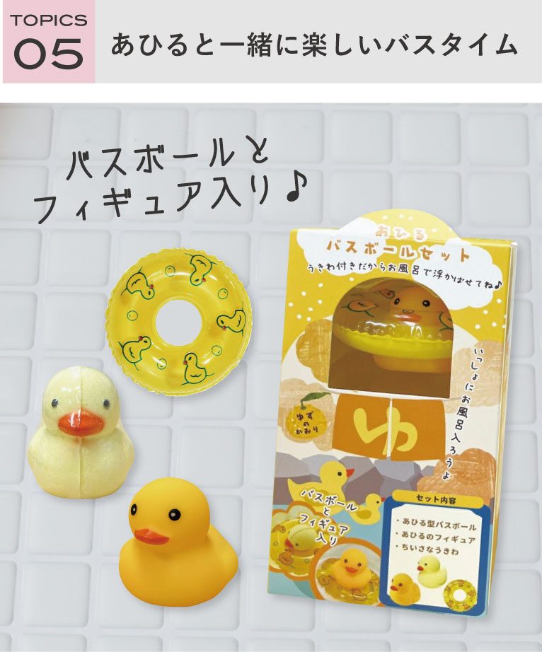 バスタイムを一層ほっこり楽しい時間にしてくれること間違いなし!あひる型のバスボールにうきわをセットして、お湯に優しく浮かべてください。