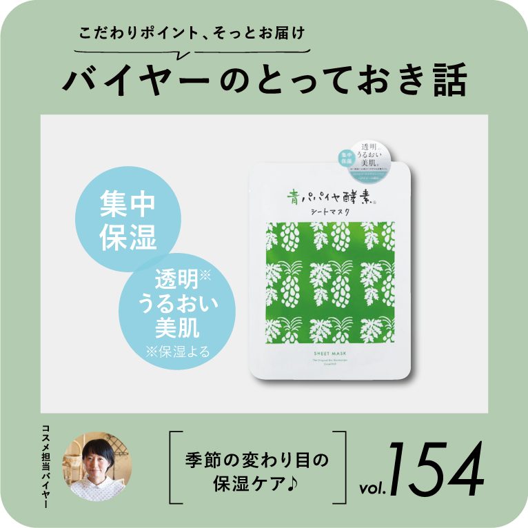 この季節は、あごニキビが突然出てきたりと「角質肥厚」によるごわごわだけでなく、毛穴ふさぎも発生してしまうことがあります。そんなうるおいバランスが揺らいだときには、古い角質を除去し、肌をなめらかにする青パパイヤ由来のパパイン配合のシートマスク!