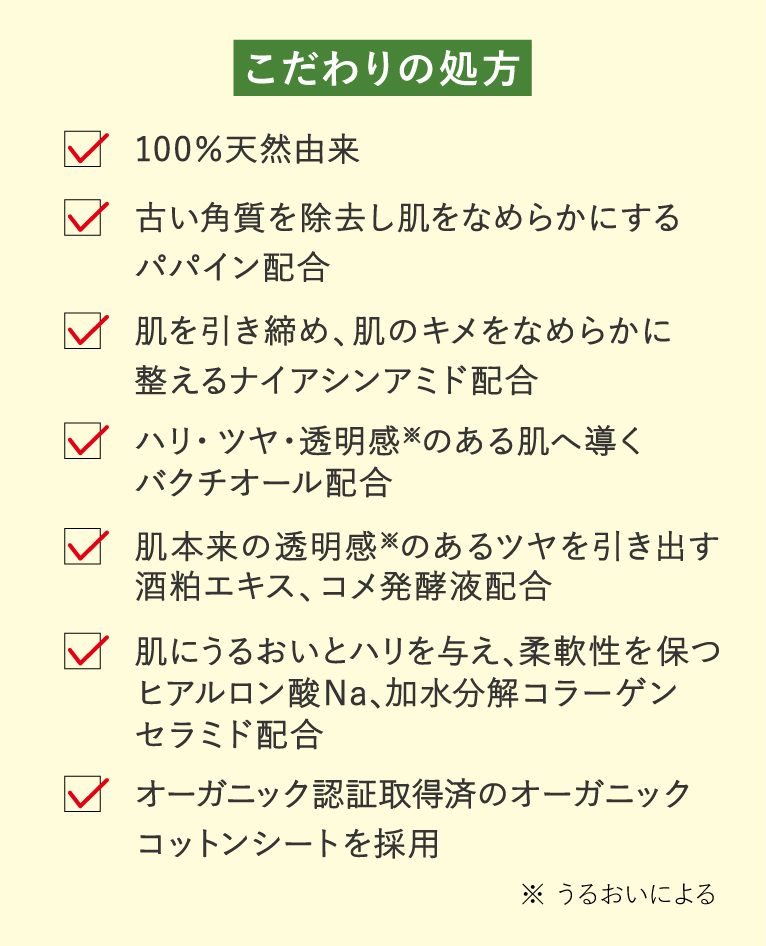 シートマスクなら貼るだけのケアで、角質のケアとうるおいケアを同時に叶えてくれます!時短もできるけど、10~15分貼れるというのもナチュラルな処方ならではです。