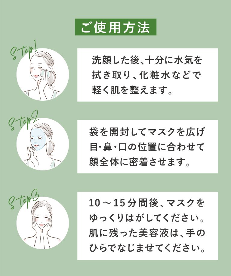 シートマスクを使い終わった後も、シートには美容液が残っているので首やデコルテ、角質の気になる所を優しくふき取るようにすると、翌日の肌のうるおいや柔らかさを感じていただけると思います。ぜひお試しください♪