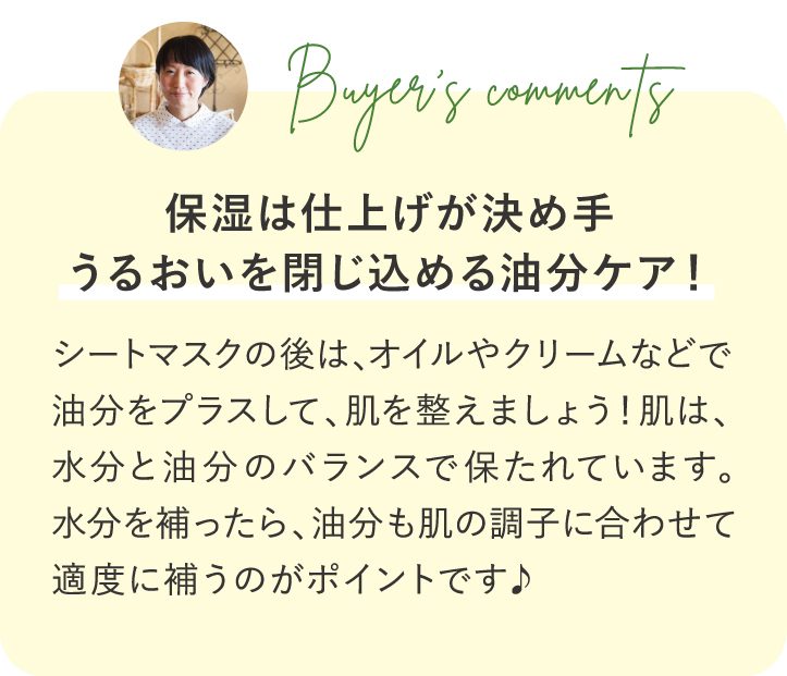 ブースターとして優秀との声が多い美容オイル。シートマスク前に使うのがおすすめですが、シートマスク後のケアでももちろんOK!忙しいときこそ、頼ってほしいアイテムです。