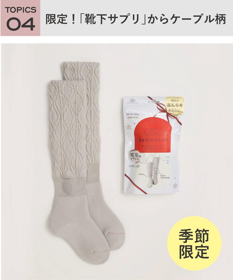 まるでこたつのようなあたたかさとやわらかさが魅力の「まるでこたつソックス」に、新しく「ケーブル柄」が登場しました!