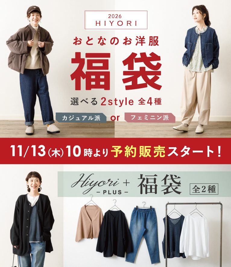 日頃の感謝の気持ちを込めて、今年もAmingオリジナルブランドのお洋服福袋2026をご用意しました!今回は『HIYORI(ひより)』だけでなく、姉妹ブランドの『HIYORI+(ヒヨリプラス)』の福袋もつくりました♪