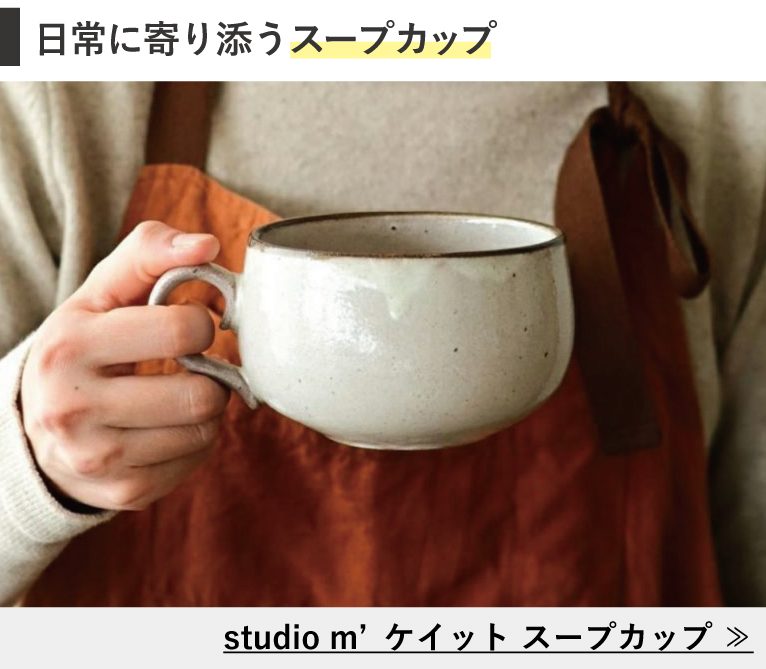 陶器らしい温もり、釉薬の透け感を感じる発色が優しく、日常にそっと寄り添うスープカップ。