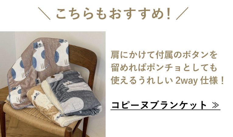 中のブランケットは膝にかけたり肩から羽織ったりするのにちょうど良いサイズ感。クッションとして置くだけで、まるで猫がそっと佇んでいるようなかわいらしい雰囲気を楽しめるのが◎