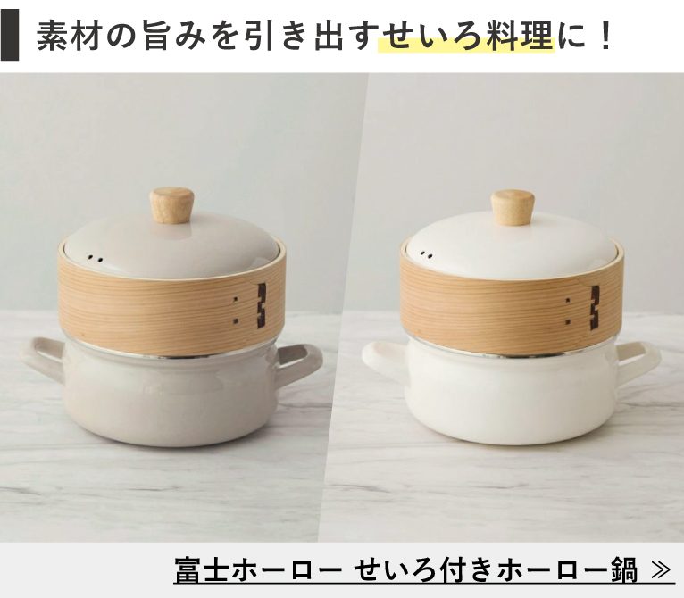 直火でもIHでも使える「富士ホーロー せいろ付きホーロー鍋」。せいろと鍋がセットになっているので、蒸す・煮る・茹でるがこれひとつでできちゃう優れモノ。毎日の食卓をより美味しく、楽しくしてくれるセットです!