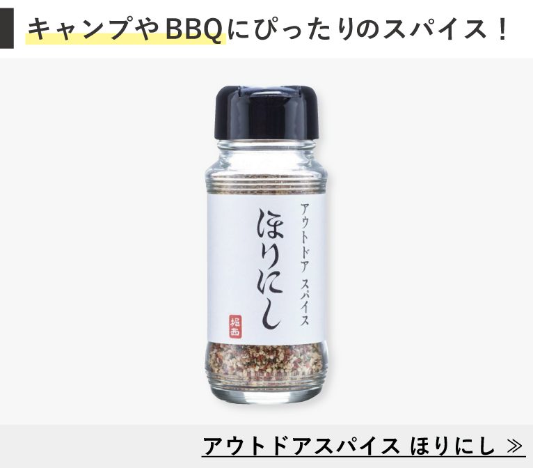 「アウトドアスパイス ほりにし」は20種類以上のスパイスや調味料をブレンドした、お肉・お魚料理、野菜炒めにも使える万能スパイスです♪アウトドア料理のお供におすすめ!