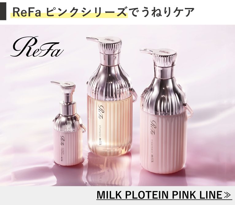 「ReFa MILK PROTEIN PINK LINE」は天然ミルク由来のプロテイン(※1)とコントロールケラチン(※2)、天然ピンクベリー成分(※3)が、髪のうるおいバランスを整えて、余計な湿気はブロック。