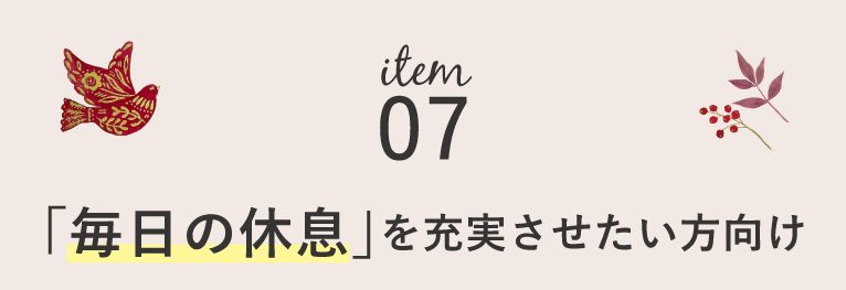 ぐっすり眠れる環境をサポートし、目覚めたときのすっきり感を感じてもらえるように、こだわりのアイテムを揃えています。毎晩の睡眠時間を楽しみにしてくれるアイテムがおすすめです♪