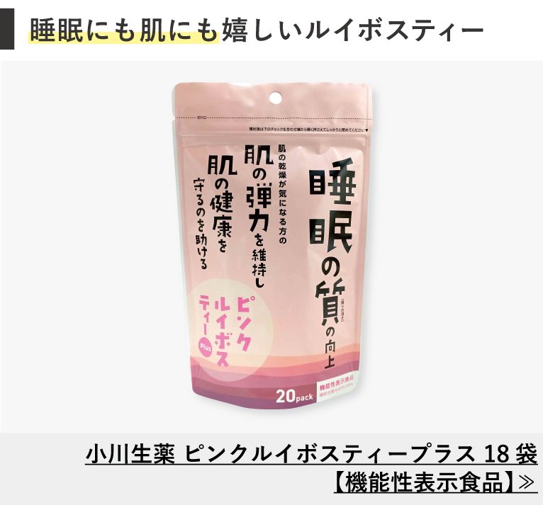「睡眠の質の向上。肌の乾燥が気になる方の肌の弾力を維持し肌の健康を守るのを助ける」機能性食品のルイボスティー。