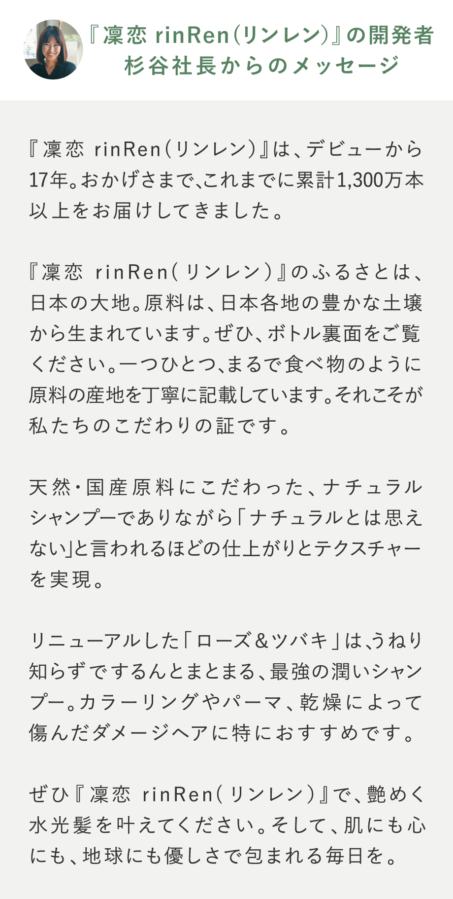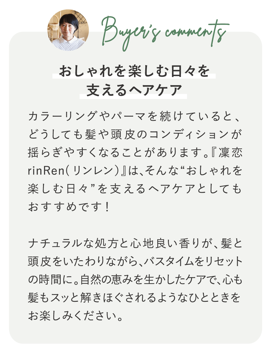 『凜恋 rinRen(リンレン)』は、国産植物の恵みを生かした「心・からだ・大地、すべてを心地良い循環へと導くエシカルヘアケア」。