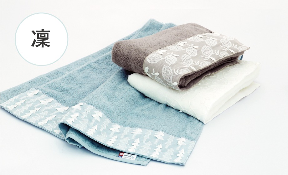 「凜」は、特徴的なレースをあしらった華やかさのあるシリーズ。レース部分の刺繍糸にもタオルと同じ糸を使い、エンブロイダリーレース織機で柔らかく立体的に仕上げられています。生地も刺繍糸も全てコットン!