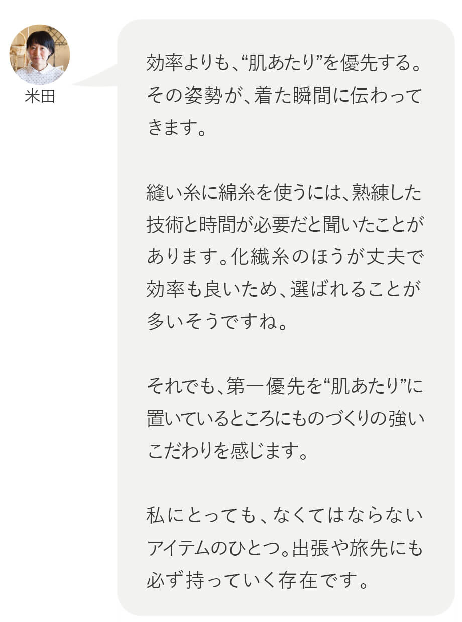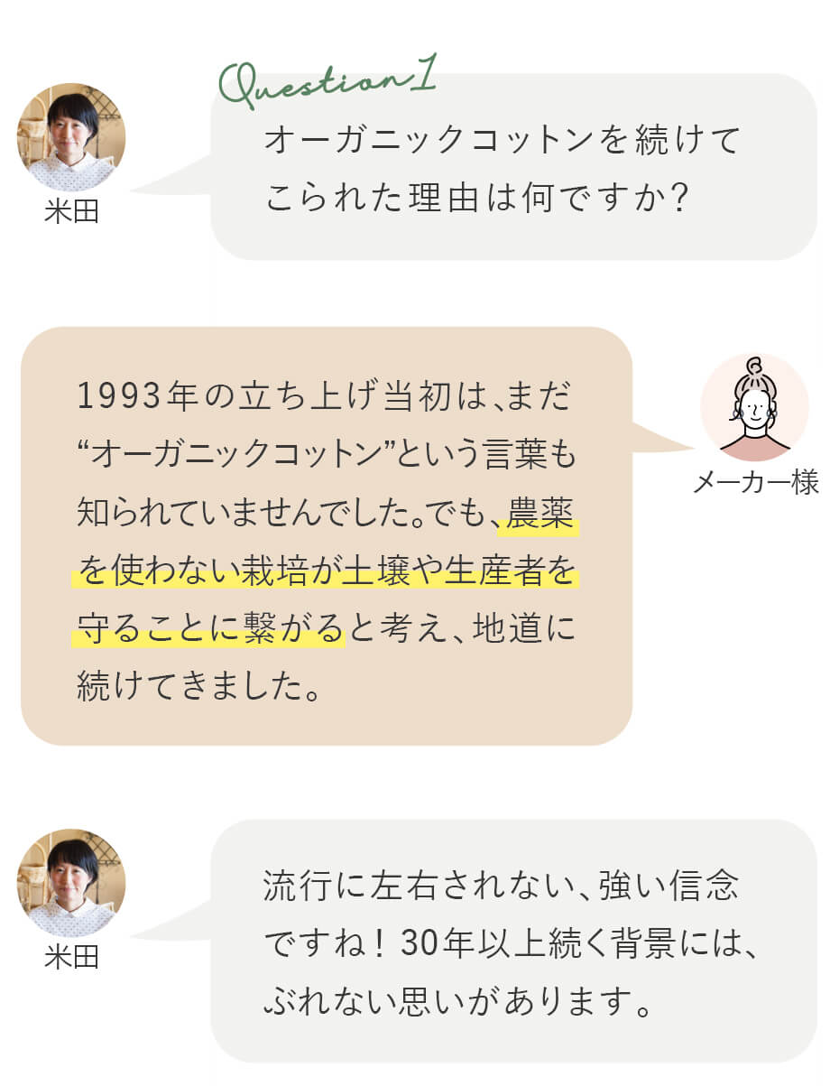 効率を優先して一斉に収穫するのではなく、綿がしっかり成熟するのを待つ栽培方法で、自然に熟して弾けた“完熟コットン”を収穫します。その時間が、素材の良さを最大限に引き出すことに繋がります。環境への配慮であると同時に、素材としての魅力を高める方法でもあるのです。今回、その思いを改めて確かめたくて、オーガニックコットンブランド『天衣無縫』のメーカー様に、お話を伺いました。