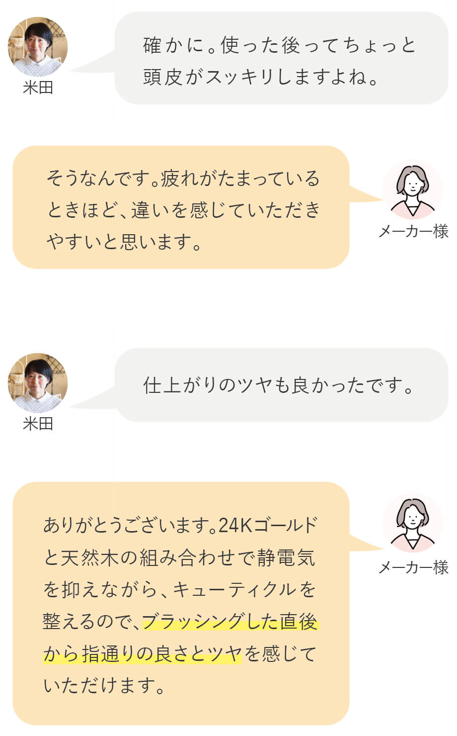 不眠やストレスなど心身のバランスが揺らぐ日々の中で出会ったのが、台湾の職人一家が手がける伝統的なカッサブラシでした。最初は、その刺激の強さに戸惑いを感じたものの、使い続けるうちに頭皮がほぐれていく(※)感覚とともに、少しずつコンディションの変化を実感していったそうです。その体験は、単なるヘアケアを超えた“整える時間”として、彼女にとっても必要な時間になりました。