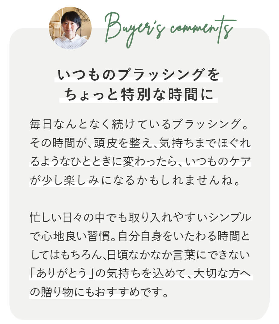 ブラシなのに、ただとかすだけじゃない。リラックスタイムに思わず手に取りたくなる、そんな一本です。