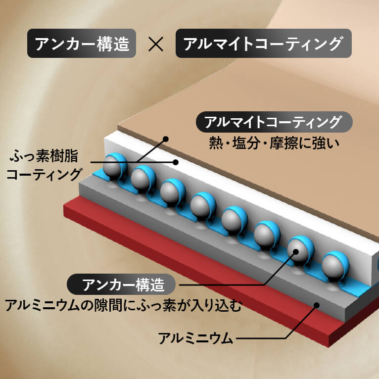 さらに、アルミの部分を錨状のアンカー構造にすることで、溝部分にふっ素コーティングが入り込み、